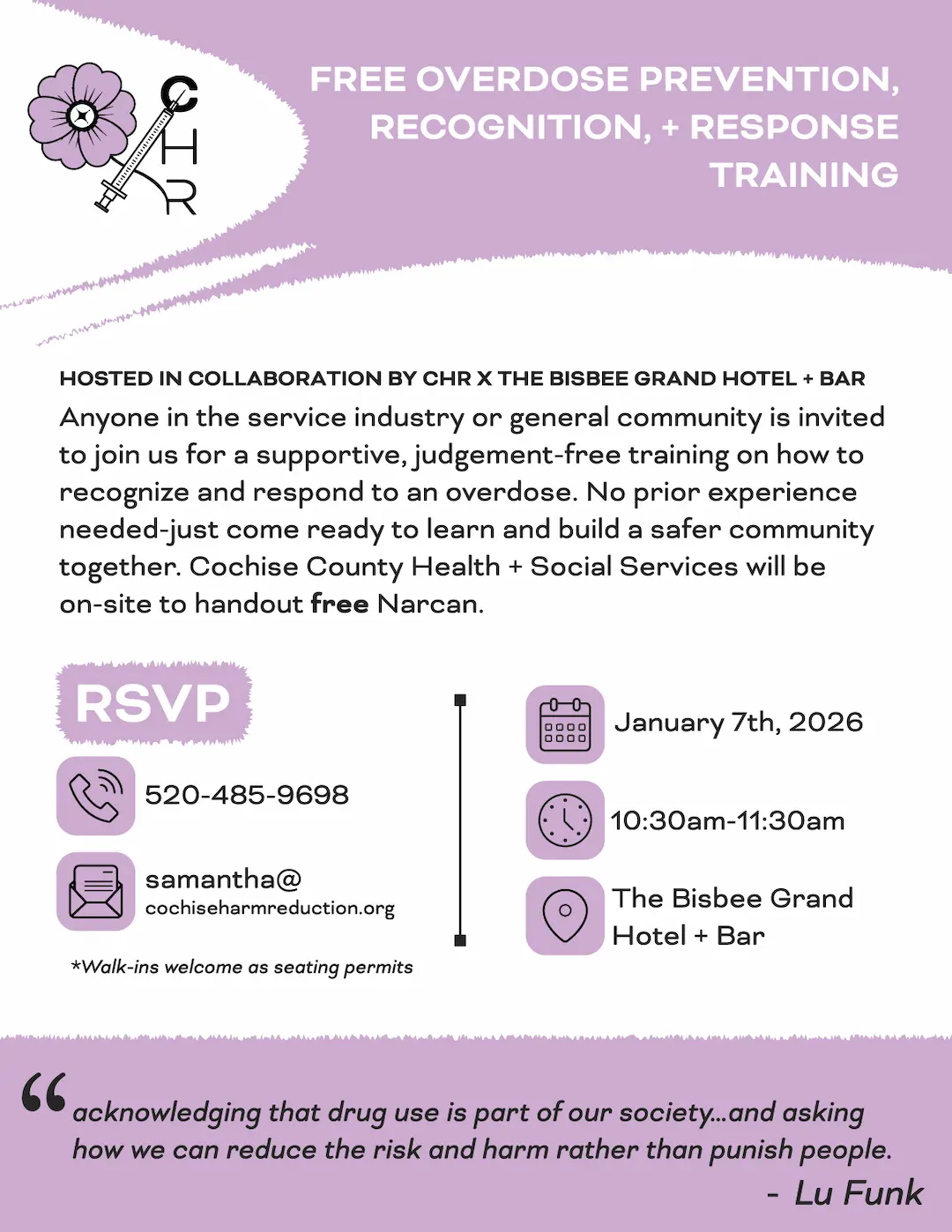 HOW: RSVP by calling/texting 520-485-6968 or emailing samantha@cochiseharmreduction.org