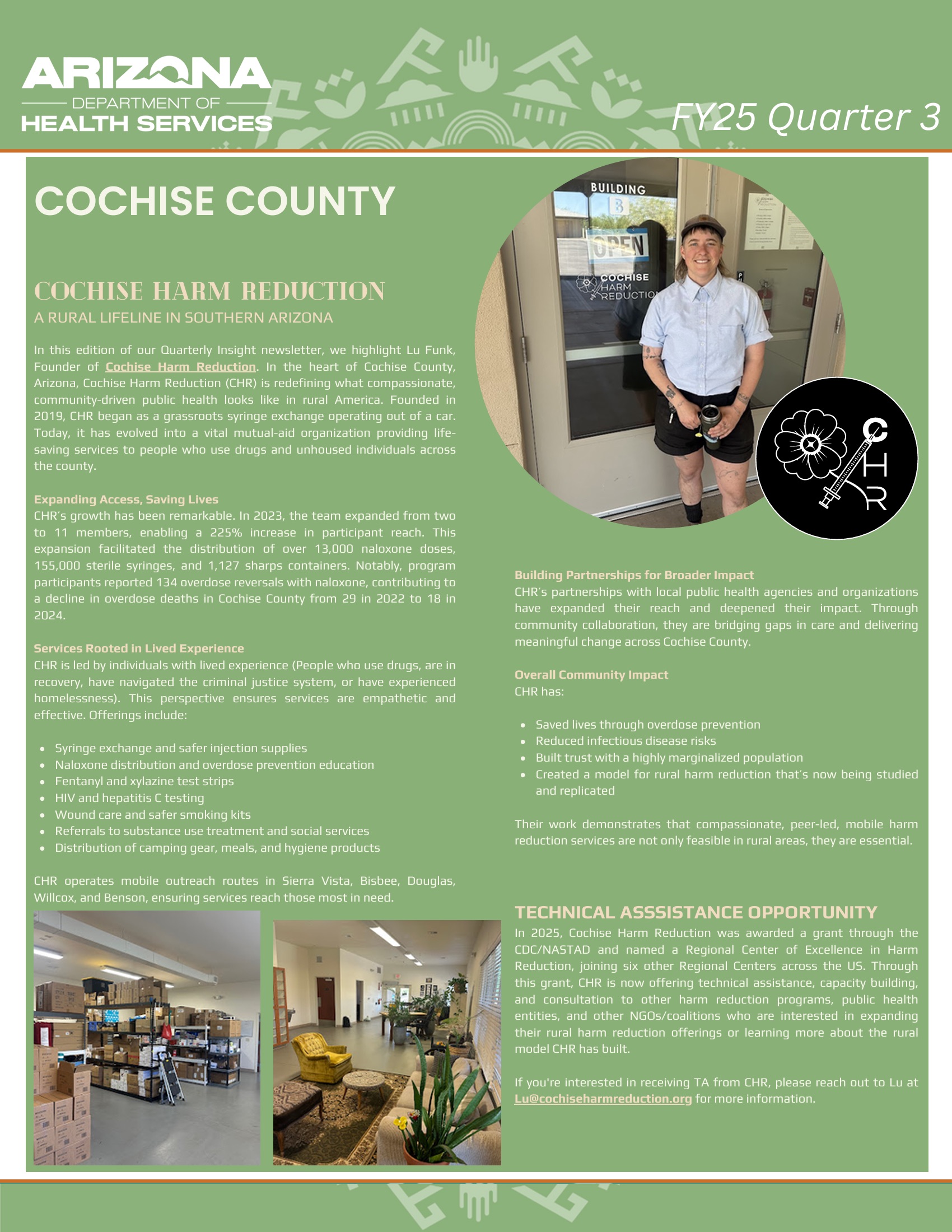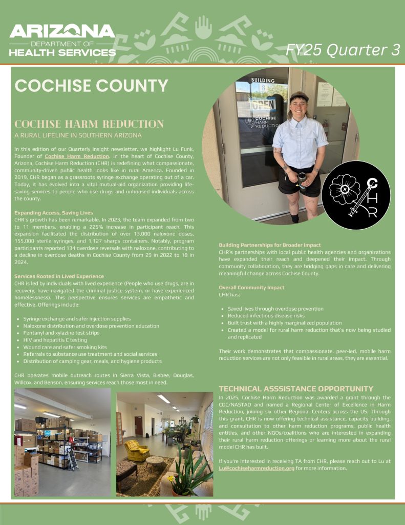 Cochise Harm Reduction (CHR), founded by Lu Funk in 2019, is transforming public health in rural Cochise County, Arizona. What began as a grassroots syringe exchange in Lu Funk’s car has grown into an essential mutual-aid organization, now serving hundreds across the region. “Our lived experience is our strength,” says Funk, emphasizing CHR’s peer-led approach—many team members have firsthand experience with substance use, recovery, or homelessness, ensuring services are empathetic and effective. In 2023, CHR expanded its team from two to eleven, allowing a 225% increase in participant reach and distributing over 13,000 naloxone doses and 155,000 sterile syringes. Their efforts have directly contributed to a drop in local overdose deaths, with participants reporting 134 overdose reversals in the past year alone.